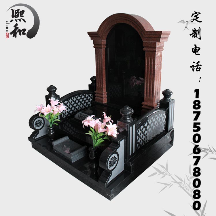 ,款式简单大方。墓碑整体使用的是山西黑石雕墓碑,盖板前面的拜台采用的芝麻黑,碑板旁边的碑柱使用的是印度红石材,整体素雅大方。碑板的大小大致为0.9米*0.6米,主要用途是用来雕刻碑文。栏板上雕刻是喷漆而成,加上碑柱两侧的碑耳和下沉的台阶。碑板与栏板之间是由是个四个山西黑石雕圆柱连接而成。碑柱上雕刻的团是莲花。该款