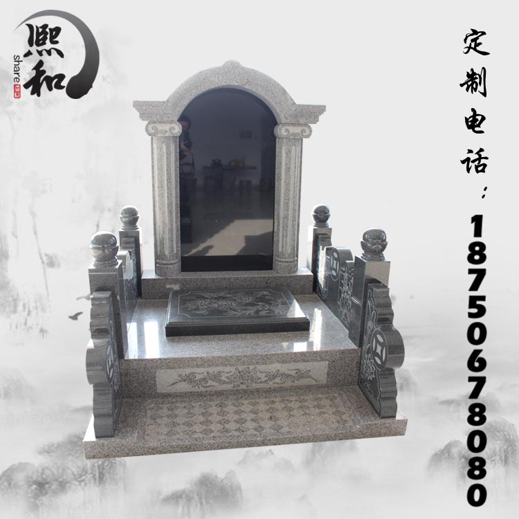 所使用的材料是最常用的主碑板山西黑,盖板芝麻黑相结合。碑板为山西黑宽0.6米高0.95米组成,主要用来雕刻碑文。款式 简单素雅,庄重大方,栏板上雕刻精美图案,加上碑柱两侧的碑耳和下沉的台阶。该款