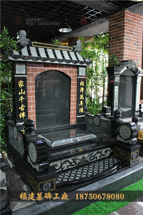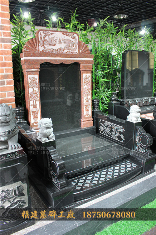 其中最常用的花岗岩石材的当属山西黑,主要因为其石材的性能比较占有优势的,山西黑的抛光度可以抛到非常亮的程度,光泽度可以达到100度以上,这是其他石材所不能达到的,所以山西黑的高光度墓碑看起来非常高档,如同一片黑色的镜子般,可以把人整个形态都倒影进去。G654染色板也是用的比较多的一种,因为G654的颜色并没有那么黑,所以人们需要对石材进行染色,最后进行抛光,当然出来的效果并没有山西黑那么好,但是价格便宜,也深受广大客户的喜欢。又或者一些客户会选择主碑板用山西黑,其他采用别的石材雕刻这样呈现出来的造型也是比较美观的。