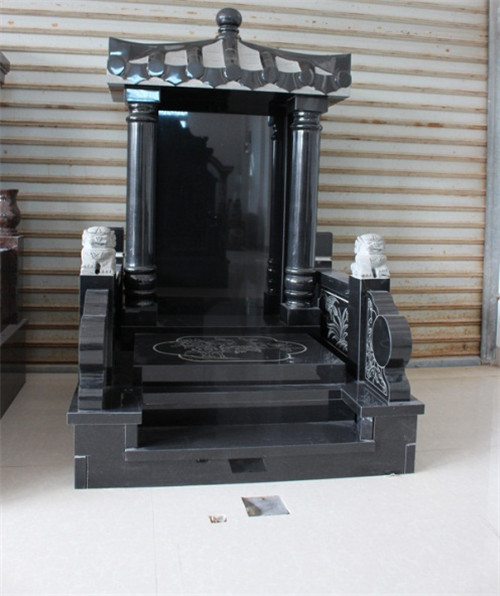 本款阁楼式墓碑全套采用山西黑制作,在主碑的两边是由两根圆形立柱支撑着阁楼,将阁楼顶盖表现的更加鲜明。碑前则采用传统辟邪石狮子用以保护墓地。盖板及墓碑的栏板采用线雕的技法,将吉祥的花纹图案描绘得清晰、美观,使逝者与自然环境零距离接触,从中获得思想升华的美好体验。搭配纯山西黑石材制作而成的墓碑给人一种深邃却又庄重的感觉,整体大方。类似这种阁楼式的石雕墓碑不在少数。阁楼,是人们休息、纳凉的场所。在我们中国道教有句话叫做“道法自然,天人合一”,讲的就是要人们与自然和谐相处。人去世后,就是回归于自然,这种阁楼式的墓碑很好的贴合了这个主题。