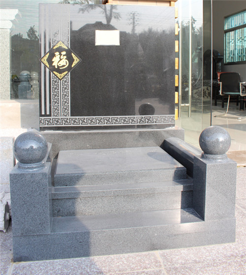 本款山西黑石雕墓碑可以说是极其简约的一款墓碑,对简单,虽然整体用材较多,但是加工工序少,性价比很高,该有的墓碑配件却丝毫不缺。经典的芝麻黑底座,山西黑碑板,搭配成了这一款厚重、规整的墓碑。四四方方的碑型前面立柱上的圆球,意味着方圆。所谓无规矩不成方圆,对于我们中国人来说,方圆就是规矩、是处事之道、是做人之本。只有方圆相辅相成,社会生活才会和谐。碑的右侧雕刻一金色福字,保佑活下的人及后辈子孙多福多寿。碑的右侧及下侧刻有类似万字符的花纹,是一种吉祥的标志。偏好这种墓碑的主人一般会是家庭相对富裕,家族兴旺,为人规规矩矩,有自己的原则和立场,生前是非常有生活哲学的人。