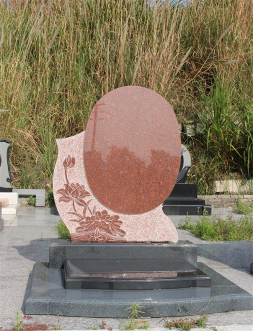 此款艺术墓碑实际上是四个部分组成,即墓碑的碑座、主碑板、底座、盖板,简约而又大方。采用印度红为主碑板,芝麻黑为底座,山西黑为盖板,主碑板以椭圆与弧形面相结合的几何形状,椭圆形光面用以刻写逝者信息,非光面处浮雕一片荷花,用以象征亡灵的高雅、圣洁;红色又代表着热情奔放,底座采用细花芝麻黑雕刻制作、表面磨光,搭配高光度的山西黑盖板给整套墓碑增添了一些庄重,代表着后人对逝者的哀思。这种主碑型更适合为国牺牲年轻的英雄烈士、本身性格鲜明热情豪迈的那些人。