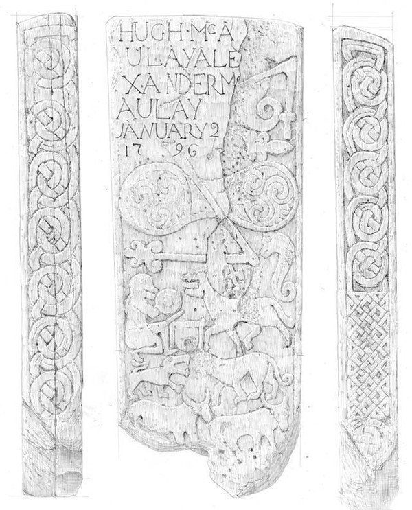 这块墓碑是在苏格兰丁沃尔附近一个早期基督教教堂遗址中找到的,墓碑的左上方上写着墓主人信息“休·麦考利;亚历山大·麦考利;1796年1月2日”。但是,在初步清理了这块石碑后,一个特殊的十字图案,透露了这块石板在被用作墓碑前的历史。