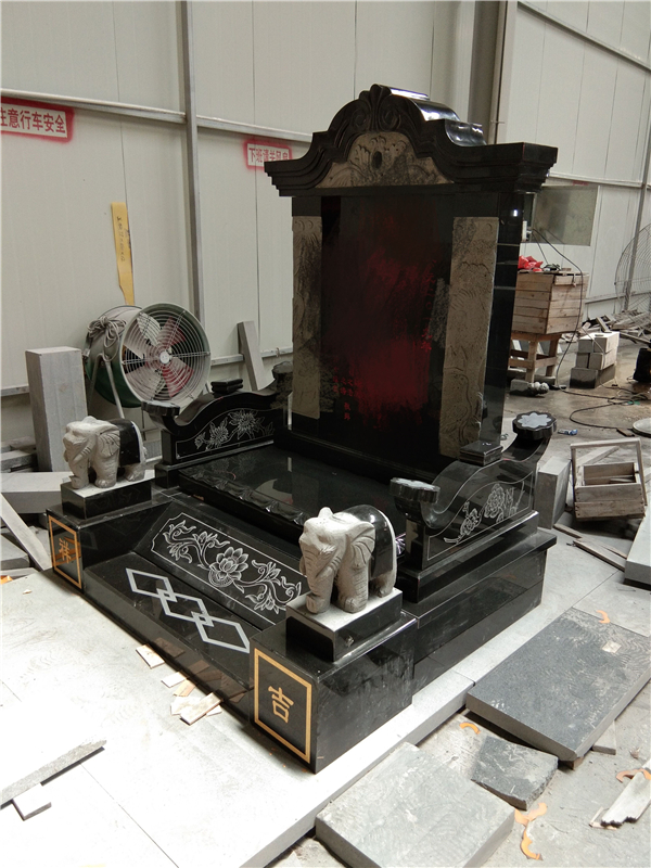 这套墓碑款式不论是用材上,还是整体造型及元素上,都比较“西式”,一般在现代陵园中相对使用较多。整体采用山西黑雕刻,刷金油漆,所以整体造价上也相对较高。碑板上正中央雕刻福字当头,寓意福气满满,旁边两根碑柱,最抢眼的就是这两只石雕小象,寓意福荫子孙财运亨通、吉祥如意。