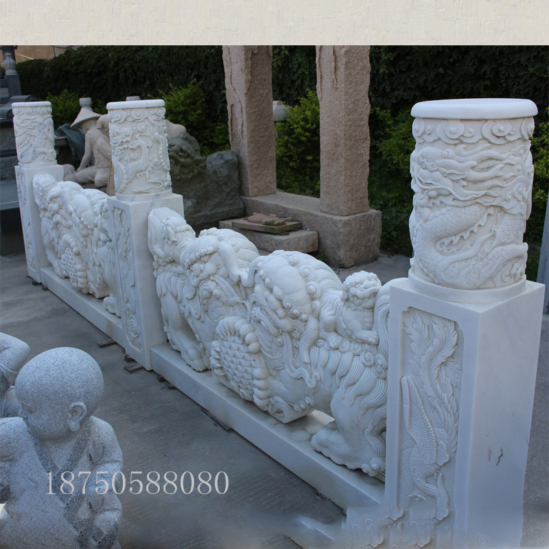浮雕神兽猛兽,象、狮、虎、龙、凤、貔貅、麒麟这些猛兽神兽自古都是力量、权势的象征,在石雕栏杆上雕刻龙则是比较多,龙在石雕产品中的应用也是比较高。