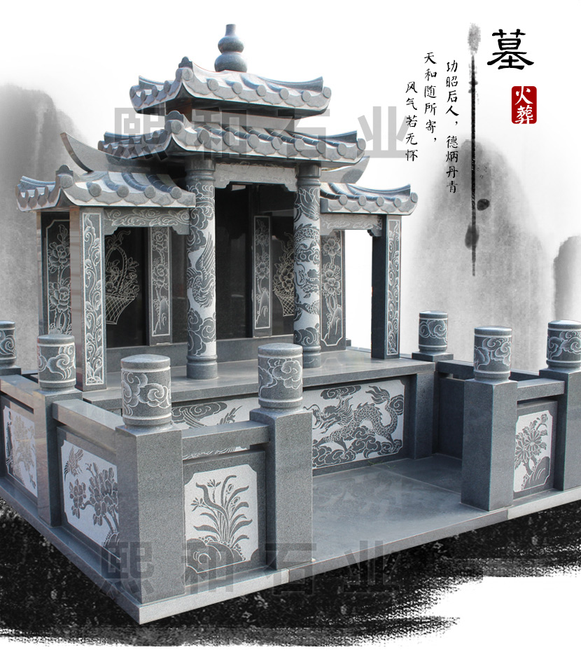 大 致高2米,长2米,宽1.6米墓碑。整体造型设计非常和谐统 一,整体美 观度极佳。瓦盖造型有点像亭子造型,碑柱上均雕刻双龙盘柱造型。当然,这些碑型也是我们结合前人的智慧和客户对于传统文化寄托的需求,不断的深化和优化得到的成果,希望以此给逝者最好的归宿。