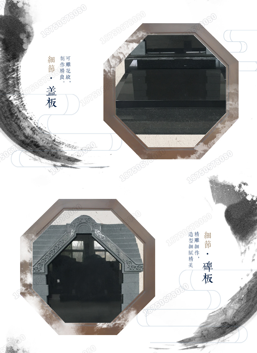 此款整体采用山西黑花岗岩石料制作,主碑板四周搭配654#芝麻黑房屋造型 双穴(单)墓碑,造型独特,与中国传统观念文化相契合,为陵园私人之首选款式。