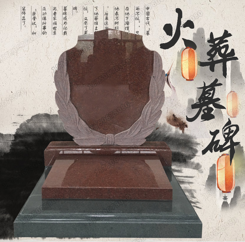 此款墓碑为艺术墓碑,整体采用印度红花岗岩石材,主碑板为不规则图形,造型独特,环绕浮雕树叶,清新简单大气。