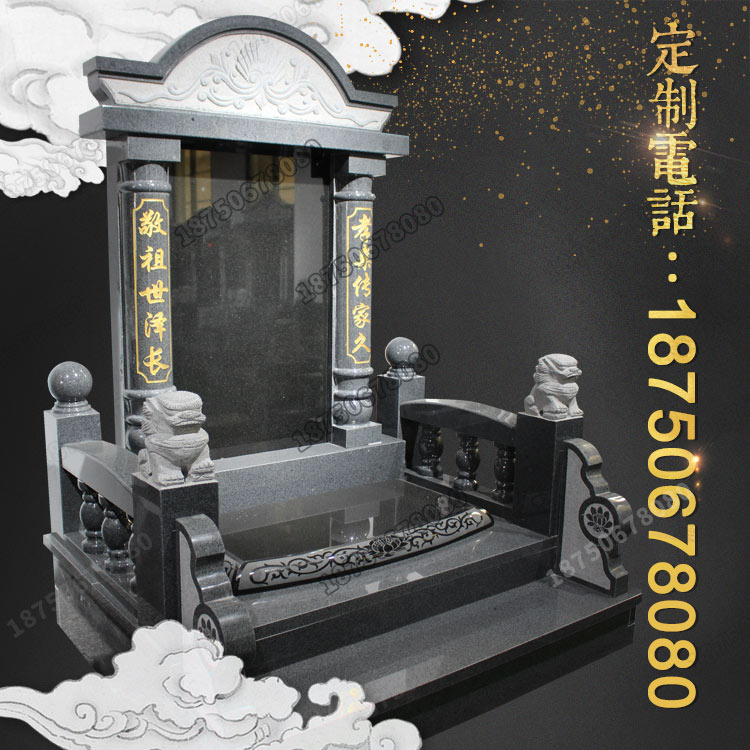 款式,在中国大多数区域客户选择的非常多。主碑板和盖板是山西黑石材,其余部分为芝麻黑花岗岩石材。