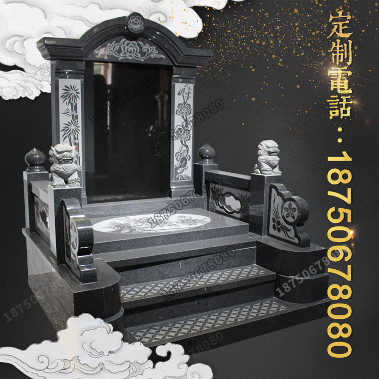 与欧式墓碑相结合,主碑板旁边的两排为雕刻植物花纹,当然这些图案和内容可根据客户当地风俗及要求进行优化。前柱使用石雕狮子和抱鼓,寓意生生不息、家族繁衍、社会繁荣。
