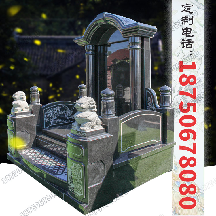 此款墓碑采用全山西黑花岗岩石材制作,整体给人以沉稳大气之感。纵观各个局部的雕刻细节,均经得起细致的考究,彰显精湛的雕刻技艺。栏板以及阶梯、盖板的线雕花鸟纹饰,栩栩如生,灵活灵现。碑柱上伫立着一对威武的石雕狮子,起着趋吉避凶的美好寓意。深受全国各地的人们喜爱,各大陵园墓碑争相定制。