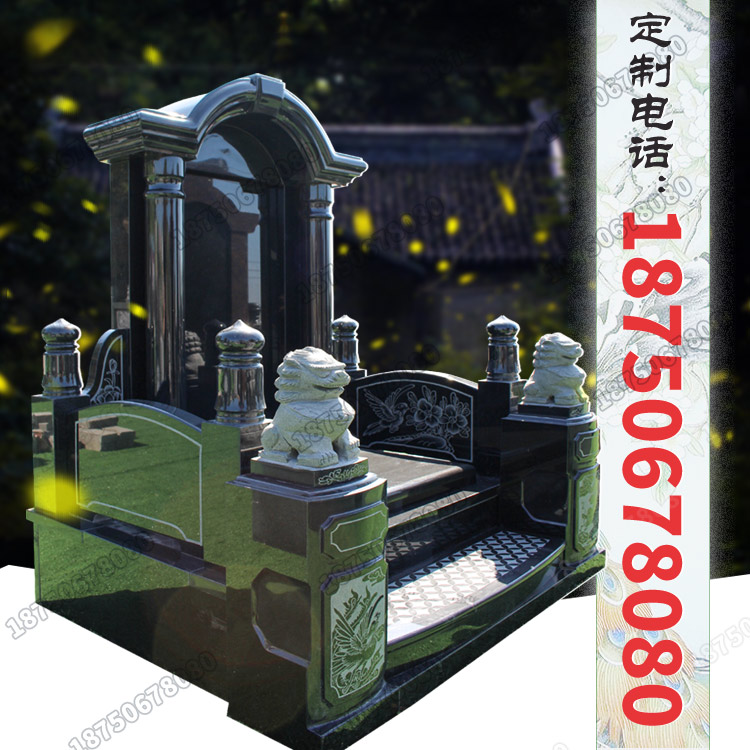 这款陵园墓碑为各大陵园热订款式,全山西黑的墓碑石材,采用多种雕刻技艺雕刻。圆雕、线雕、浮雕相互配合,呈现出完美的豪华中式石雕墓碑,圆弧形的碑顶、经典的罗马柱无不体现墓碑的端庄大气,栏板的线雕花鸟纹饰给墓碑的气息增添一丝灵动,碑柱上伫立的一对石雕狮子起着镇宅、趋吉避凶的美好寓意。
