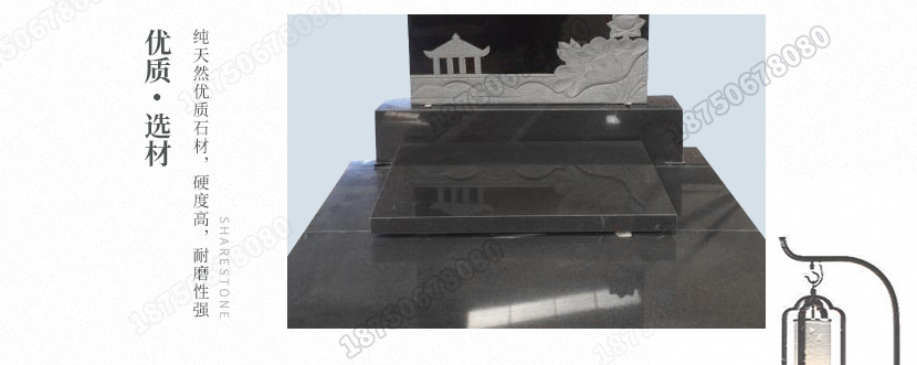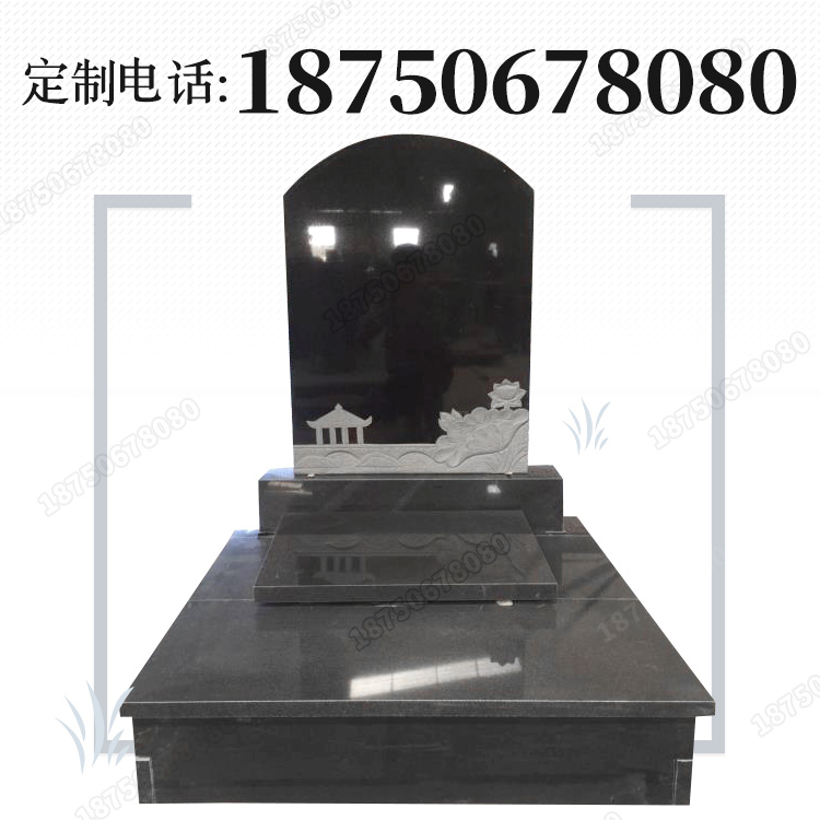 在云南曲靖农村地区相当流行,采用山西黑石材作为主碑板,抛光度极高,并用浮雕技艺在主碑板下方雕刻瓦盖亭子,拱桥和莲花等纹饰,营造了一番美好的景色。,寄托了生者对逝者的么好希冀和愿望。基座和盖板则都是采用芝麻黑花岗岩石材建造的,整座墓碑简单又不失大气,黑色给人以庄严稳重的感觉。这款墓碑在云南曲靖、昭通、保山等地的回民居住在都非常流行。