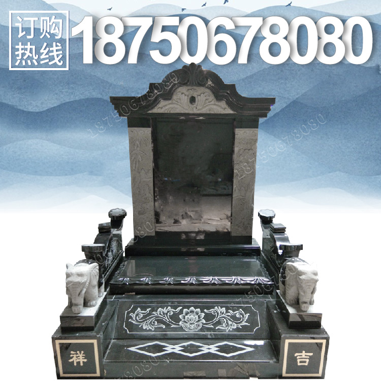 当然这款墓碑特别的地方出了立柱部分,还有上面的大象,大象是比较少用在墓碑上面的,主要是大象过于温顺,不太适合在阴宅摆放,但是这里是身披黑色铠甲的大象,寓意战象的寓意,所以摆放在墓碑上是可以被理解和接受的,大象除了吉祥的寓意以外,还有镇宅的作用。