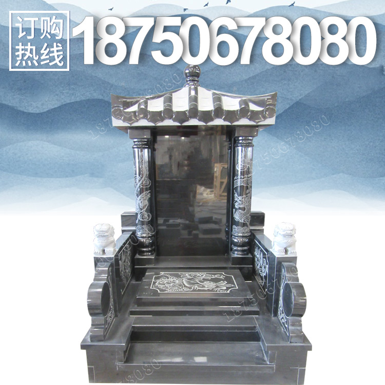 这款墓碑造型完全是仿古石雕墓碑造型,把石雕文化和墓碑文化结合起来的作品,山西黑的材质结合中式凉亭的碑帽,中式龙柱的加入,传统门鼓石,传统石雕护栏,石雕狮子,花鸟石雕盖板,整体作品呈现一种让人回到古代的感觉,这款墓碑的层次感也非常强烈,从下至上,六层的高度也寓意这个墓碑的主人有着极高的权威,社会重要性不可而寓,所以这款墓碑适合德高望重之人,展示一种高贵身份。