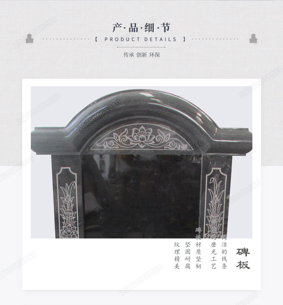 此款墓碑为小型墓碑样式,融入了许多传统元素,拆分成多个部件,再对各个部件进行加工制作,连细节都会处理得到,最后组装出来的墓碑自然是比较优秀的。