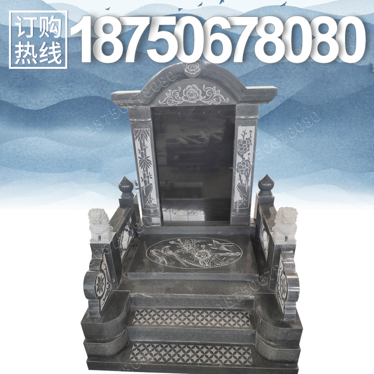 此款墓碑主碑采用山西黑石材制作,其他为花岗岩654石材雕刻,还是一款典型的传统墓碑样式。由碑顶、主碑、碑柱、盖板、栏杆、台阶、底座制作而成,结构复杂,需要分开加工,后面在进行组装,这样细节都可以处理得很到位,也能保证墓碑的完整性。