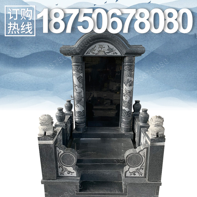 此款也是较为新型传统墓碑款式。墓碑所使用的材料为花岗岩中的印度黑和芝麻黑,整体造型简单素雅,庄重大方。碑顶采用曲型造型,配合线雕工作已雕刻了莲花图案,象征圣洁,碑板两侧以翠竹样式线雕点缀,盖板上雕刻鸟语花香,再来就是护栏位置,模仿景观栏杆的造型并设计有抱鼓石,表面上以线雕工艺进行加工雕刻,前柱使用石雕小狮子,不仅为墓碑增添了艺术气息和美感,同时寄托了生者对逝者的美好希冀。