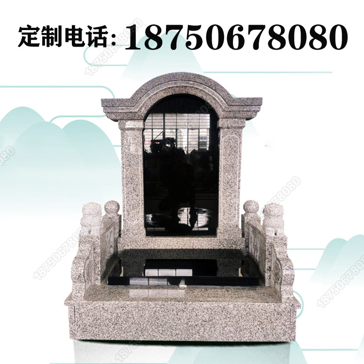 墓碑在雕刻过程中对石材上要求是比较严格,需要满足雕刻需求,不然有好的工艺,没有合适的石材也呈现不出来。此款墓碑采用花岗岩芝麻白石材和印度黑石材雕刻而成,这种石材不易风化,硬度好,根据测试,它们的外观和颜色可以保持数多年不变。碑型庄严肃穆,整体造型层次分明。前柱使用石雕狮子,寓意生生不息、家族繁衍、社会繁荣。套墓整体雕刻细节把控很好,不论从圆雕、浮雕和线雕的搭配协调,产品整体档次较高。