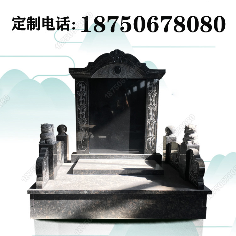 此款中式石雕墓碑主碑采用印度黑石材其他均为654,这两种石材都是属于花岗岩石材。众所周知花岗岩石材质地坚硬,加工困难,工时长,手工费比较高,但是所呈现出来的作品也是成正比的,看起来具有很高的工艺观赏价值。