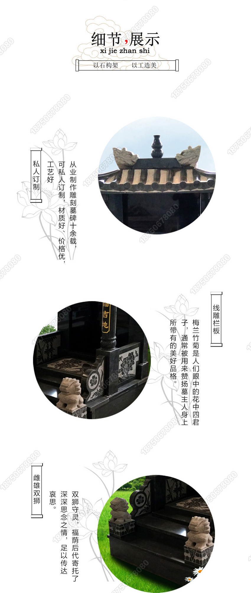 此款墓碑是近期出厂的一款墓碑,采用屋檐式造型作碑顶,顶端雕刻双龙造型装饰,碑柱是对联的形式雕刻后面再涂上金漆,栏板和盖板以线雕工艺的宝瓶、梅兰竹菊、鸟语花香点缀,碑前还有一对小狮子寓意吉祥昌盛。墓碑整体造型设计和谐统一,整体美观度较佳,主碑使用印度黑石材其他均为654石材,在用料上算是比较不错的。
