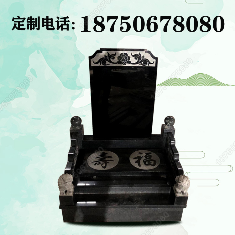 此款墓碑主碑采用印度黑雕刻其余为654石材,这两种石材都属于花岗岩,坚固且适合雕刻。整体结构分明,简洁大方,碑顶及盖板上雕刻了莲花和福寿文字,寓意福寿安康,栏板的线雕竹节寓意逝者的品格。总的来说,墓碑装饰往往通过浮雕、影雕等雕刻工艺刻画出各种不同的纹样图案,墓碑定制比直接选择现货的区别就在可以根据实际情况选择,满足对墓碑的外观进行艺术化地装饰,从而增添墓碑的艺术审美价值。