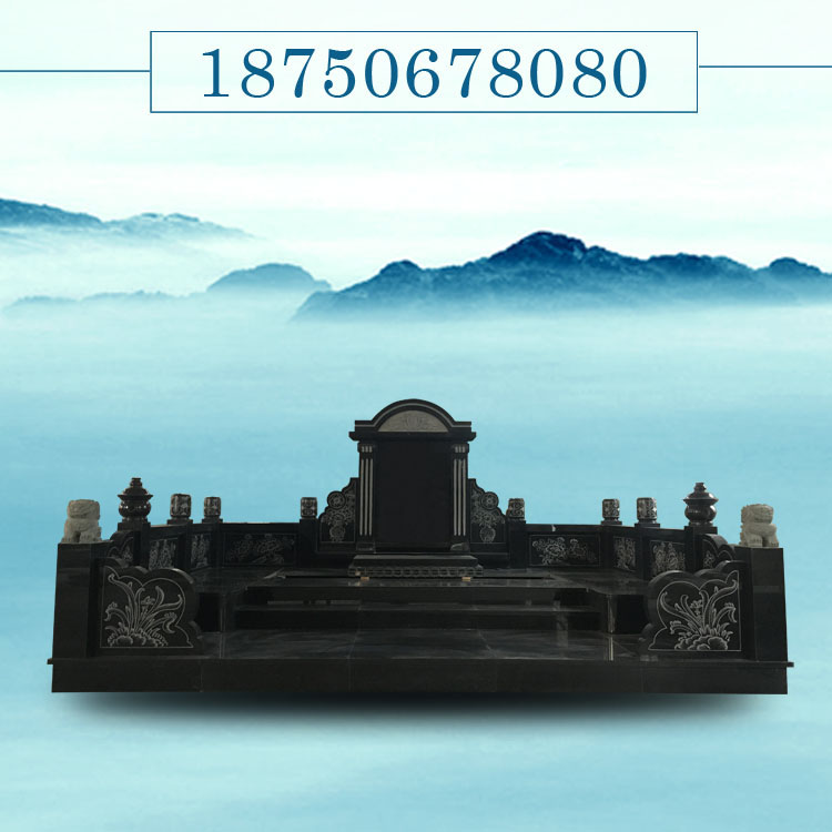 墓碑被视为逝者的安息之地,在中国墓葬文化中,夫妻合葬是一种很常见的墓葬习俗,夫妻合葬也是婚姻文化的一种产物,反映了人们对于美好爱情的向往和追求。依墓碑的样式来说,因为是合葬墓,所以较一般单人墓碑的尺寸稍大,尤其是碑的宽度,因为其所需要雕刻文字的内容会较多。这款墓碑作为中国风欧式传统墓碑款式,碑顶为欧式房屋造型,搭配栏板、盖板、合适的比例及精致雕刻细节,产品整体呈现出来的档次及感觉非常高档。主碑板和盖板是印度黑和珍珠黑两种石材相辅相成制作而出的。400*300的尺寸,占地面积较大,整体非常的大气,高贵典雅。左右两侧由雌雄双狮守灵,寄托了深深的思念与哀思之情。