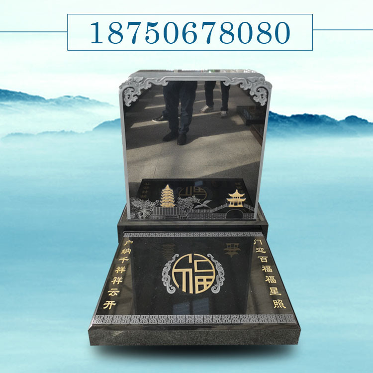 人在百年之后,墓碑是人们对死者埋葬处所做的一种纪念性的载体,是人们生活必不可少一部分,更是每个人生命的最终归宿。此款墓碑为中式简单墓碑,它看起来庄严,大气,主碑上弯曲弧度造型为其装饰,在墓碑书写上注入一份专注与笃志。此款墓碑采用印度黑石材,高约0.9米,宽约0.8米,部分地方采用了浮雕的雕刻技法,刻画出了吉祥图案表达出美好的寓意,在整体造型制造上非常和谐统一,美观度较佳,使墓碑整体看上去更加美观、华丽。