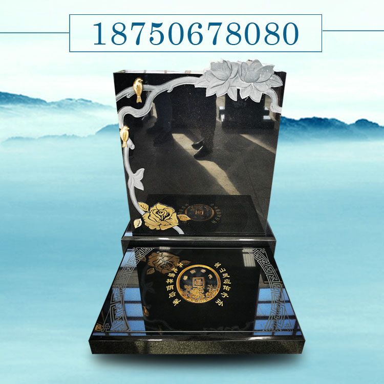 新中式墓碑,一般都会配上些传统元素的花纹图案,寓意着好运吉祥。此款墓碑整体采用印度黑石头,长约90厘米,宽约80厘米,碑顶上雕刻着朵朵莲花给整套墓碑带来生机盎然的的感觉,花草植物终究是墓碑设计师最喜欢的元素。整块墓碑大多采用打磨抛光设计,使墓碑表面具有很好的光泽度,提升墓碑的色泽和美观,制作出符合逝者个性喜好的艺术墓碑,适应时代的潮流。碑座上刻了字样表达对逝者的思念与寄予后代的美好的希望。
