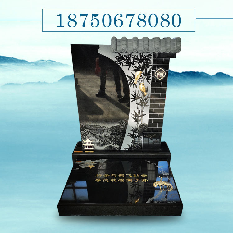 小型艺术墓碑在石材上的耗费大大减少,但是对于石材的质量要求仍是非常严格。除了要求石材质地坚硬、纹理均衡、耐风吹日晒之外,还要保证石材容易切割的特点。印度黑石材就满足了所有质量要求,此款墓碑规格为90*80,采用印度黑石材定制,主碑上屋檐式的浮雕造型,并雕刻生气勃勃的青竹,花鸟相结合,传统吉祥纹饰,寓意美好。