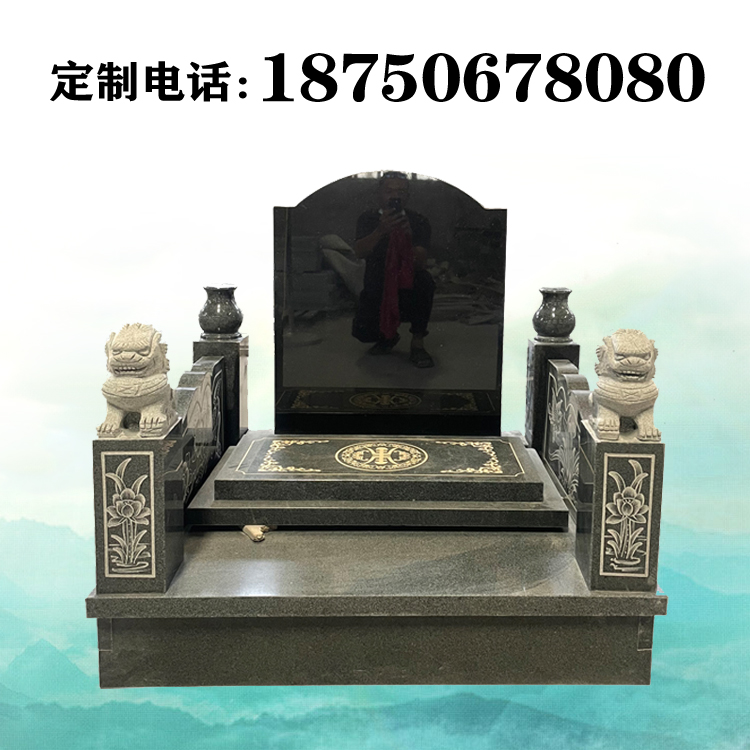 此款墓碑整体才用印度黑、芝麻黑制作而成,占地110*90,碑顶为半弧形,寓意圆润美满,碑盖及栏板上以线雕工艺的雕刻莲花有逝者灵魂登仙极乐的吉祥寓意,两旁柱子刻画石狮圆雕,威武霸气,栩栩如生,有护佑灵魂、镇邪避邪之意。整座墓碑综合了多种雕刻手法,造型庄重而大气,广受青睐。