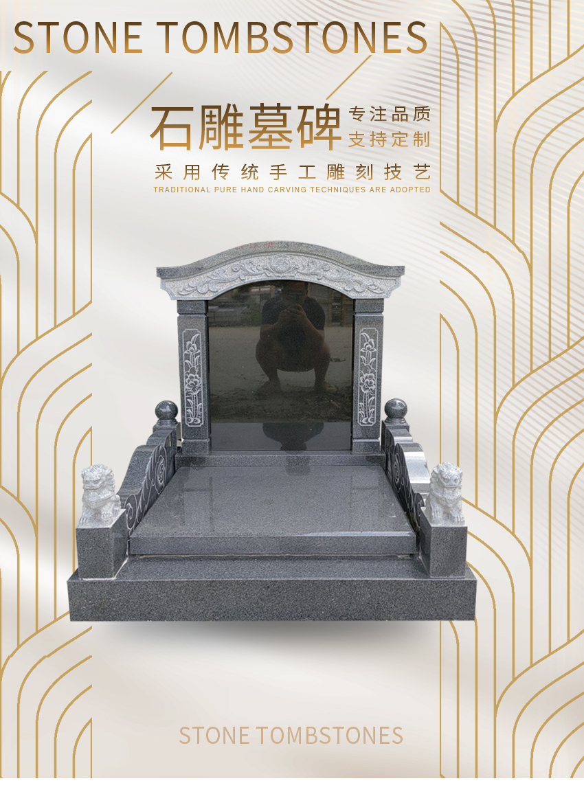 中式墓碑带有典型的民族特色,在墓碑的每一个部件中都体现得淋漓尽致,例如这款墓碑的碑顶碑柱及栏板部分都采用了莲花元素,莲花寓意新生,纯洁,美好,加上碑柱的石狮子,让整个墓碑少了一些悲伤的情绪,而多了一份自然,真实,给人以非常舒适的感受。