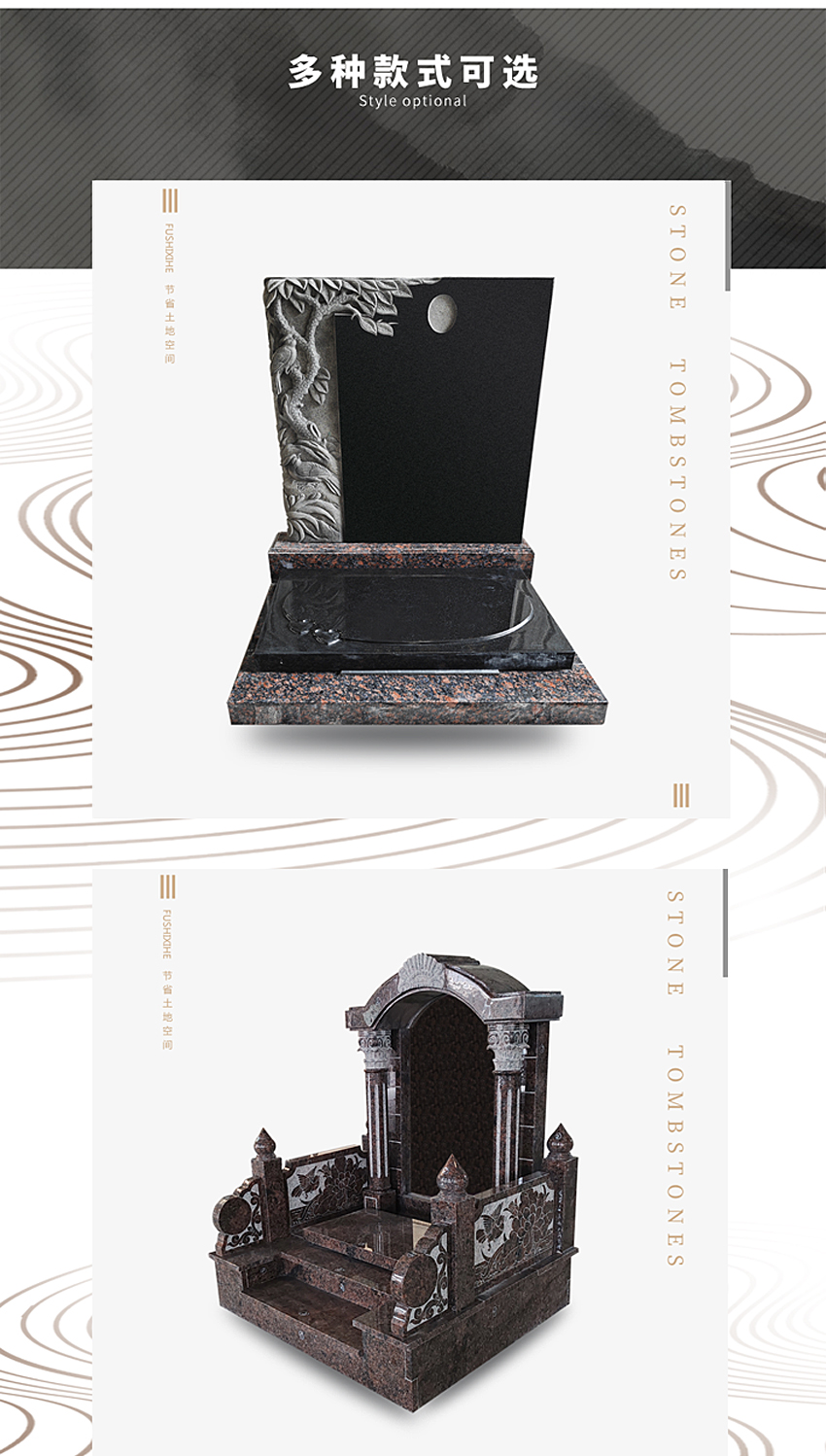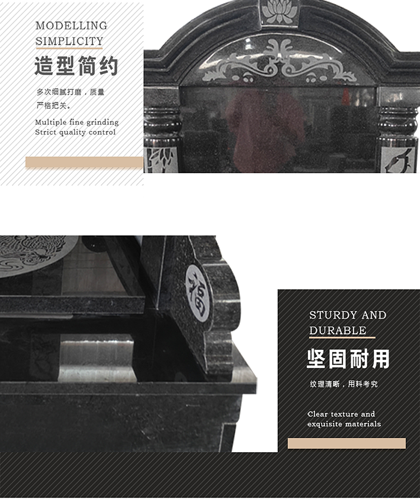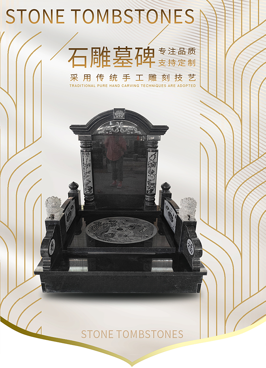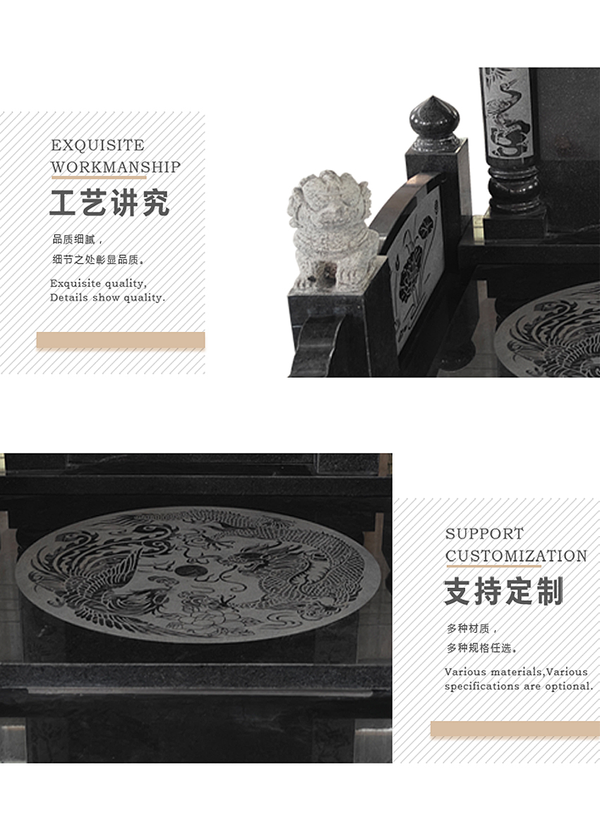 福建墓碑加工厂注重产品质量,从选材到制作都严格把关,因为我们拥有一支技术不错、经验丰富的制作团队,他们用心制作每一款墓碑,确保每一款墓碑都是符合出厂标准。在福建墓碑厂家的众多款式中,有几款特别受欢迎的墓碑款式值得推荐。首先是“龙凤呈祥”款,这种墓碑采用传统龙凤图案作为主题设计,寓意着吉祥如意、幸福美满;其次是“山水相依”款,这种墓碑以山水为背景设计而成,给人一种宁静、祥和的感觉;最后是“竹林仙鹤”款,这种类型墓碑以仙鹤松柏为主题设计而成,充满了传统气息。上图中这款墓碑集合了多种传统元素,如莲花、竹子、仙鹤、龙凤、荷花、狮子等图案,工艺上更为讲究,,成品效果佳。