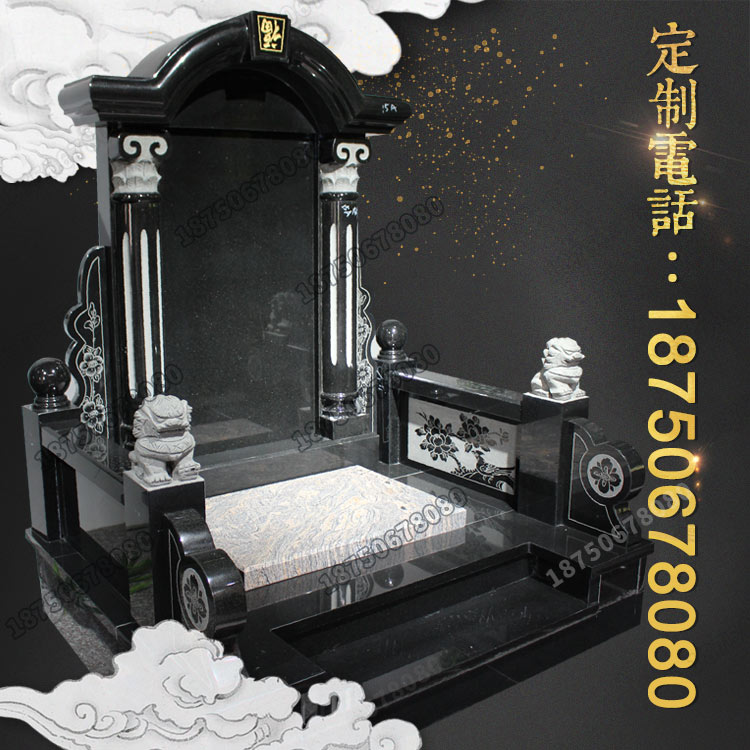 墓碑所使用的材料是最常用的主碑板、盖板山西黑,其余部件芝麻黑相结合。款式简单素雅,庄重大方,盖板上雕刻鸟语花香