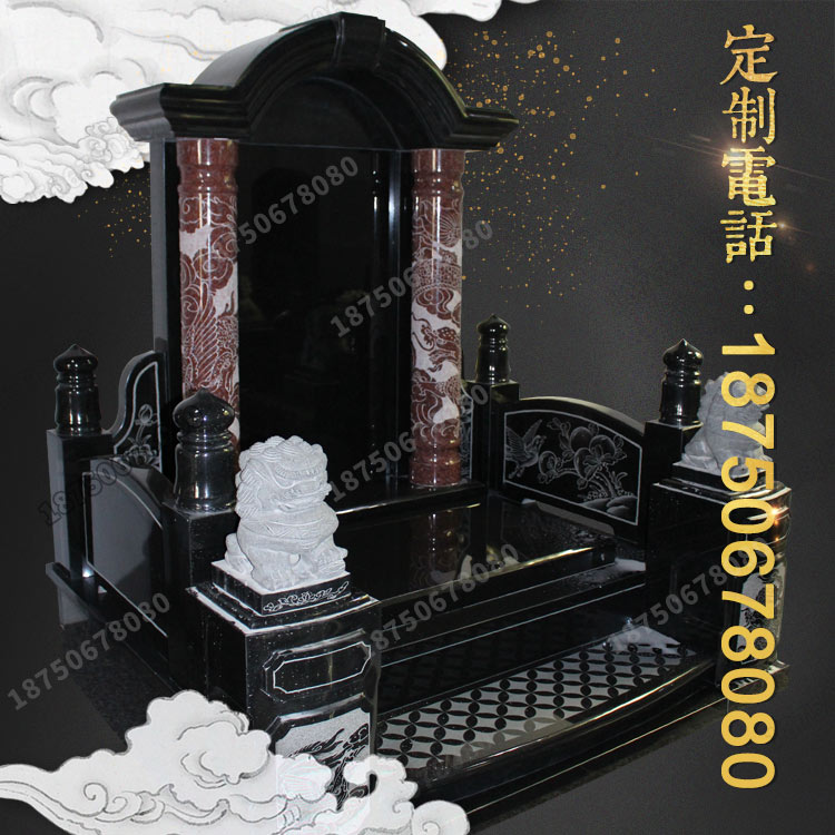 大部分采用山西黑花岗岩石材,碑柱为印度红线雕龙凤柱,整体造型为宫殿式豪华款式,花鸟线雕,雕艺精湛,栩栩如生。碑前柱坐落一对石雕狮子,寓意辟邪纳吉、彰显权贵保平安。碑柱的前段为微浮雕风龙,造型灵活大气,凸显整套及