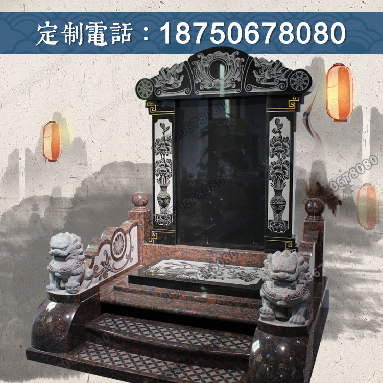 与欧式墓碑相结合,主碑板旁边的两排为线雕花瓶柱,当然这些图案和内容可根据客户当地风俗及要求进行优化。前柱使用石雕狮子,寓意生生不息、家族繁衍、社会繁荣。