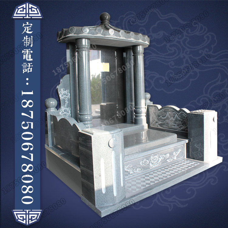 为纯芝麻黑花岗岩豪华款式,瓦房式造型的碑顶,搭配简单的罗马柱,花草碑耳线条柔美,山水线雕的栏板,整体
