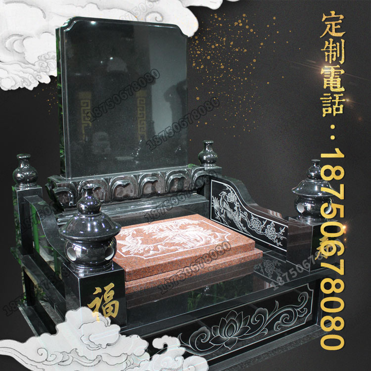 前柱正中央雕刻福字当头,寓意福气满满,主碑板的底座采用莲花底座,寓意福荫子孙财运亨通、吉祥如意。印度红线雕盖板,在色彩上与山西黑深色系搭配得当,提升整座墓碑的档次。当然,随着现代墓葬的集中化和个性化,不论是在材质上还是造型上,大家接受度都越来越高,这样的款型也就司空见惯了。