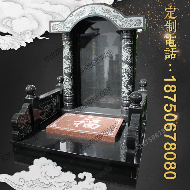 墓碑所使用的材料是最常用的山西黑,盖板印度红相结合。款式简单素雅,庄重大方,盖板上“福”字,寓意吉祥。