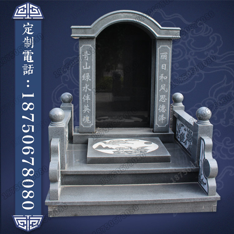为中式传统花岗岩石雕墓碑,碑型款式较为传统典型。碑柱似门帘雕刻着对联寄托着美好的寓意,盖板、栏板柱以及抱鼓均采用线雕技艺,突出墓碑的档次。整块