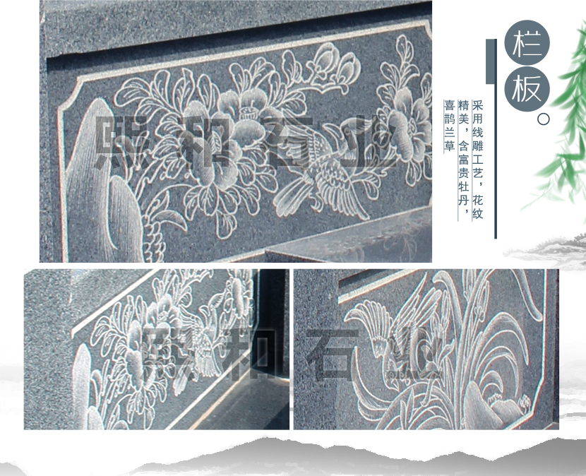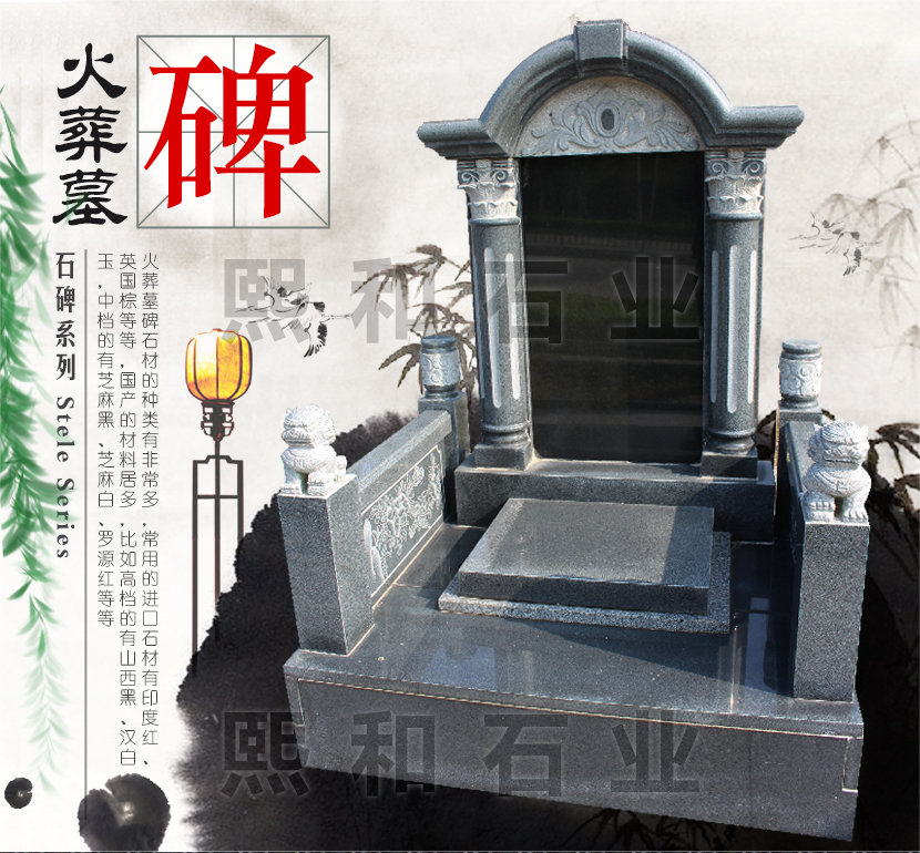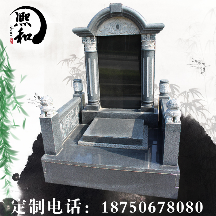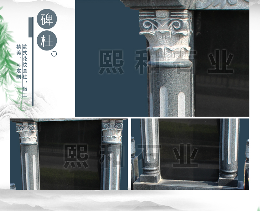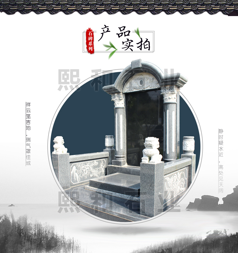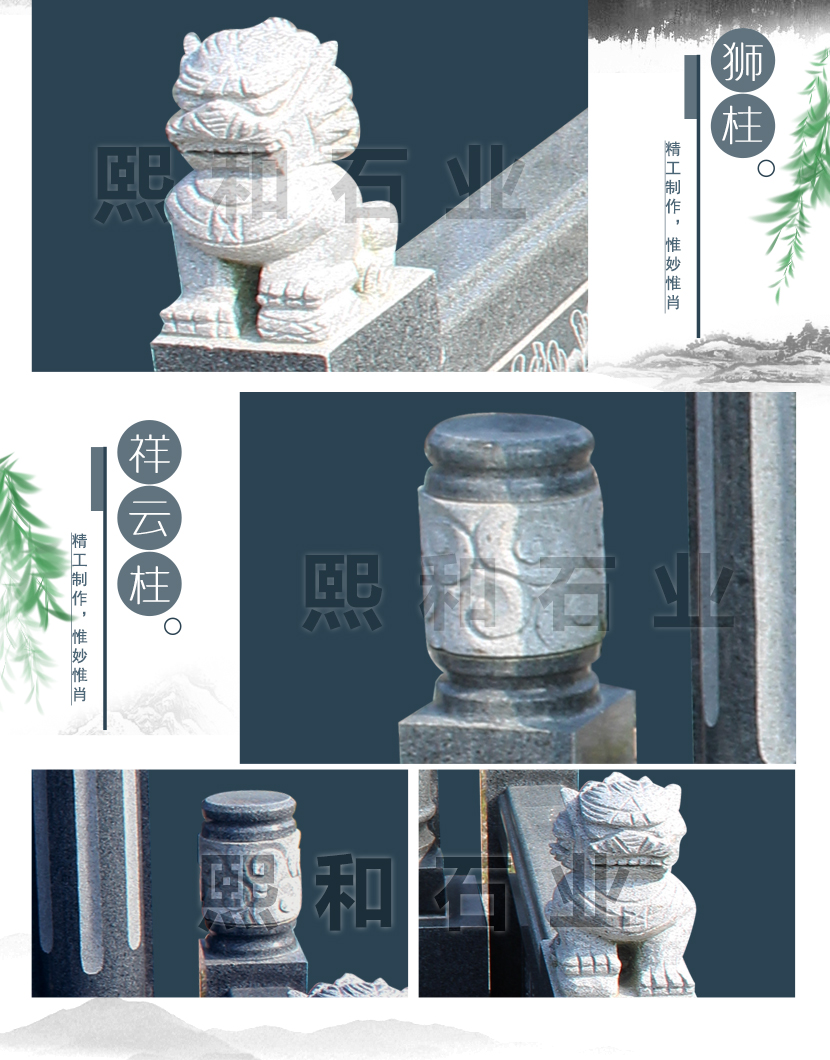 的核心点在于碑顶和圆柱,碑顶中间上四方形,欧式款式,搭配栏板、盖板、抱鼓合适的比例及雕刻细节,产品整体呈现出来的档次及感觉非常高档。前柱使用石雕小狮子寓意生生不息、家族繁衍、社会繁荣。