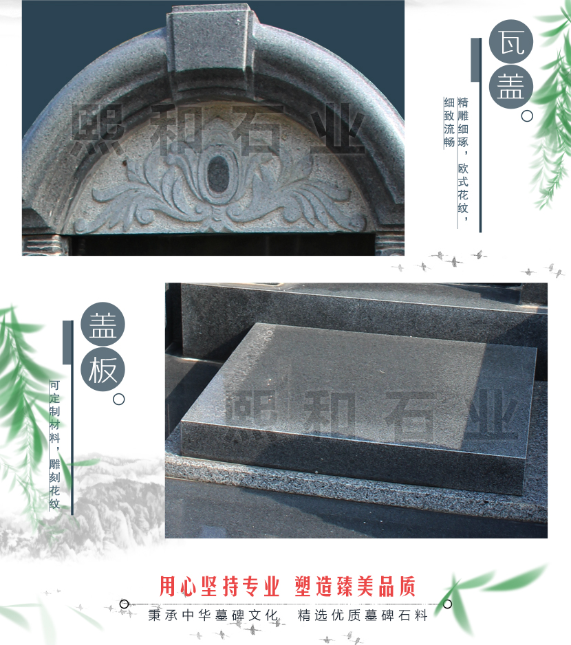 形式,在中国大多数区域客户选择的非常多。材料上是芝麻黑加山西黑家芝麻白的经典材质搭配,山西黑与芝麻白为主碑板,盖板与围板为山西黑。