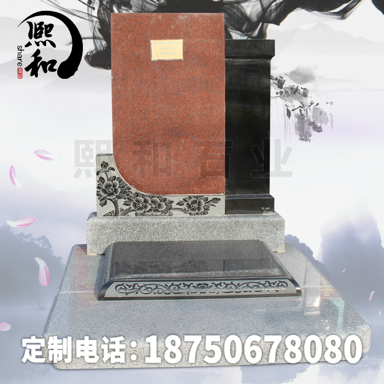 墓碑所 使用的材料是最常用的主碑板山西黑与印度红相结合,盖板芝麻黑相结合。碑板为山西黑宽0.6米高0.9米组成,主要用来雕刻碑文。款式 简单素雅,庄重大方。艺术墓碑一般都是造型简单,主碑板红黑相间整体感觉庄重大方。底座为芝麻黑石材雕刻而成,整体造型设计非常和谐统一,整体美观度极 佳。当然,这些碑型也是我们结合前人的智慧和客户对于传统文化寄托的需求,不断的深化和优化得到的成果,希望以此给逝者最好的归宿。