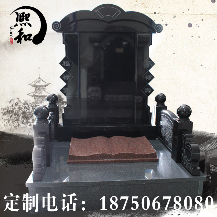 大 致高1.6,长1.25米,宽1.1米墓碑。主碑板两侧位正方形造型山西黑雕刻福禄寿。碑柱上雕刻的是精美图 案,栏板上方放置的是圆形石柱。盖板的造型为书本石材由印度红雕刻而成,底座为芝麻黑石材雕刻而成。整体造型设计非常和谐统一,整体美观度极佳。当然,这些碑型也是我们结合前人的智慧和客户对于传统文化寄托的需求,不 断的深化和优化得到的成果,希望以此给逝者最好的归宿。