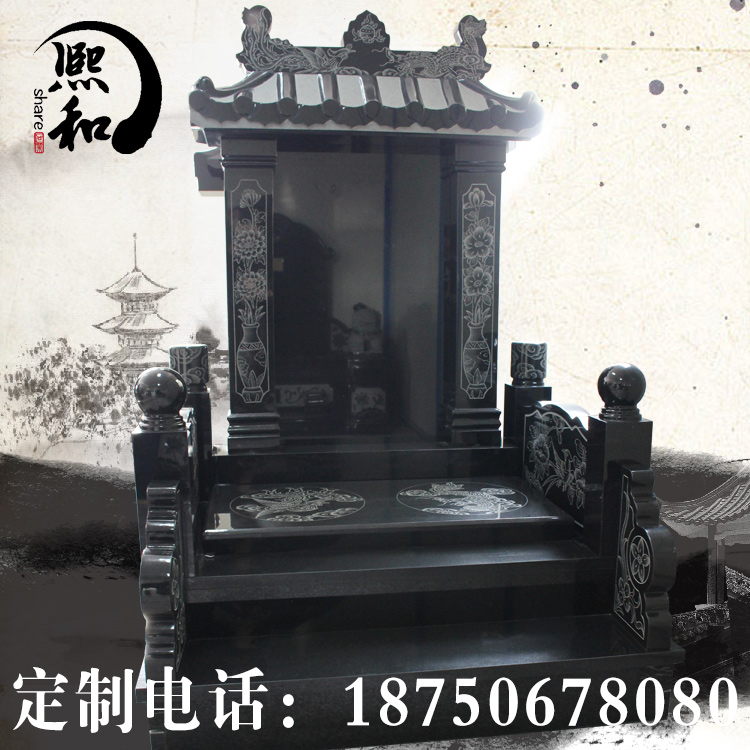 大 致高1.6,长1.1米,宽1.2米墓碑。瓦盖为屋檐造型,最上方雕刻的是龙凤戏珠。主碑板两侧方形柱子上边放置山西黑雕花圆柱。碑柱上雕刻的是精美图 案,栏板上方放置的是圆形石柱。整体造型设计非常和谐统一,整体美观度极佳。当然,这些碑型也是我们结合前人的智慧和客户对于传统文化寄托的需求,不 断的深化和优化得到的成果,希望以此给逝者最好的归宿。