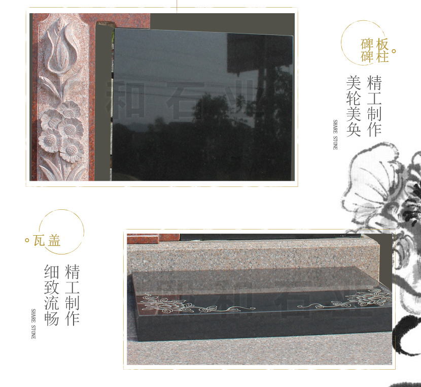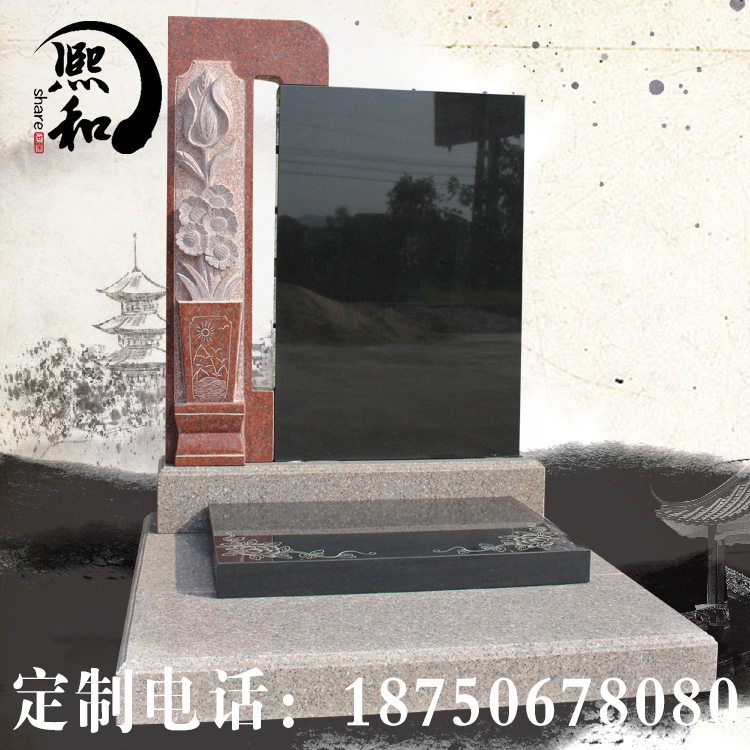 墓碑所使用的材料是最常用 的主碑板山西黑跟印度红拼接而成,盖板印度红相结合。印度红石材比山西黑高。此款为单人墓碑,盖板简单雕刻。碑板为山西黑宽0.6米高0.8米组成,主 要 用来雕刻碑文。碑板上印度红石材上雕刻花朵。款式 简单素雅,庄重大方。底座也是有山西黑石材雕刻而成。该款