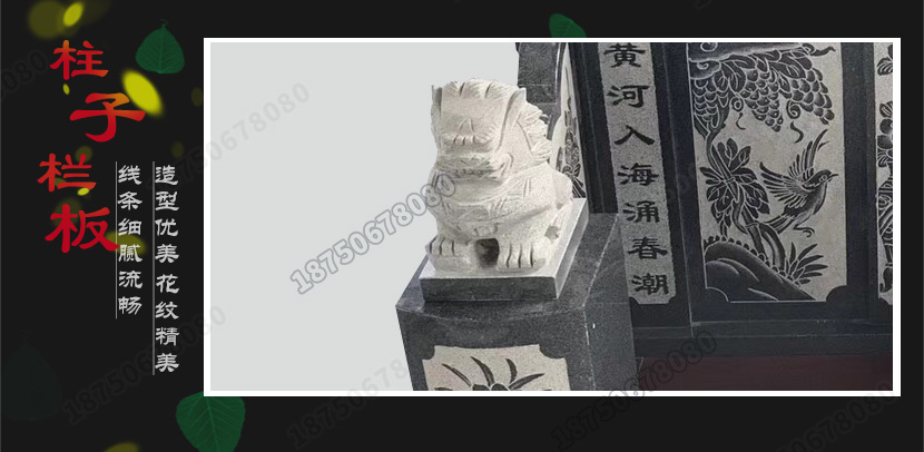 这类墓碑款式大多出现在我国福建宁德、浙江温州等地,碑体较高,骨灰盒为垂直放置。因此需要较高的瓮,我厂雕刻的这套墓碑选用优质的山西黑花岗岩石材雕刻而成,结合多种雕刻工艺。采用圆雕、线雕等多重工艺相结合,花鸟纹饰图案寓意美好,能够更好的寄托人们对逝者的希冀和缅想。