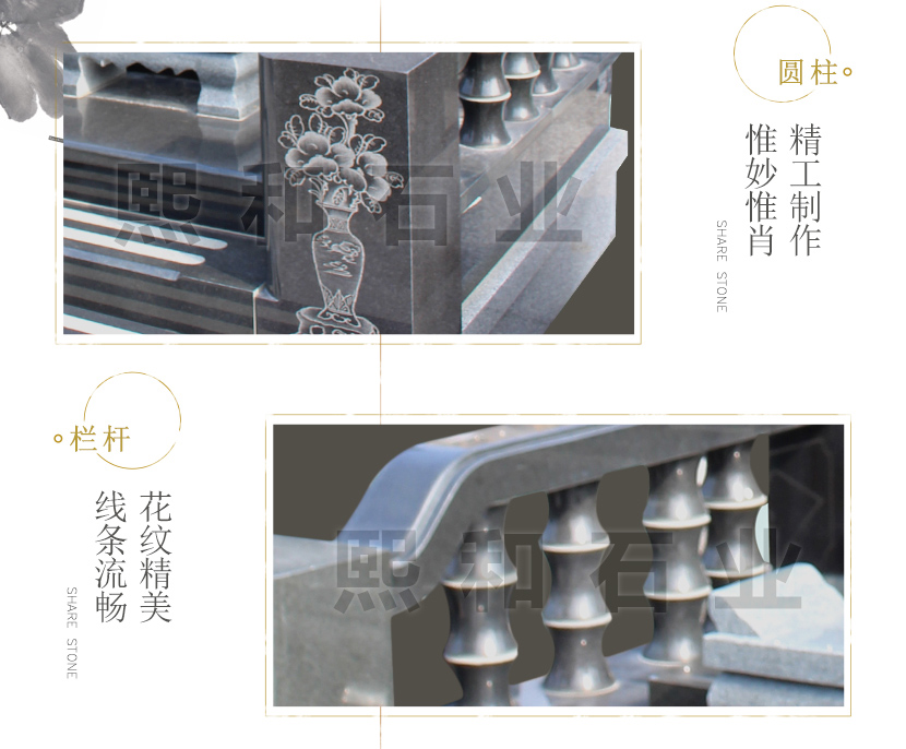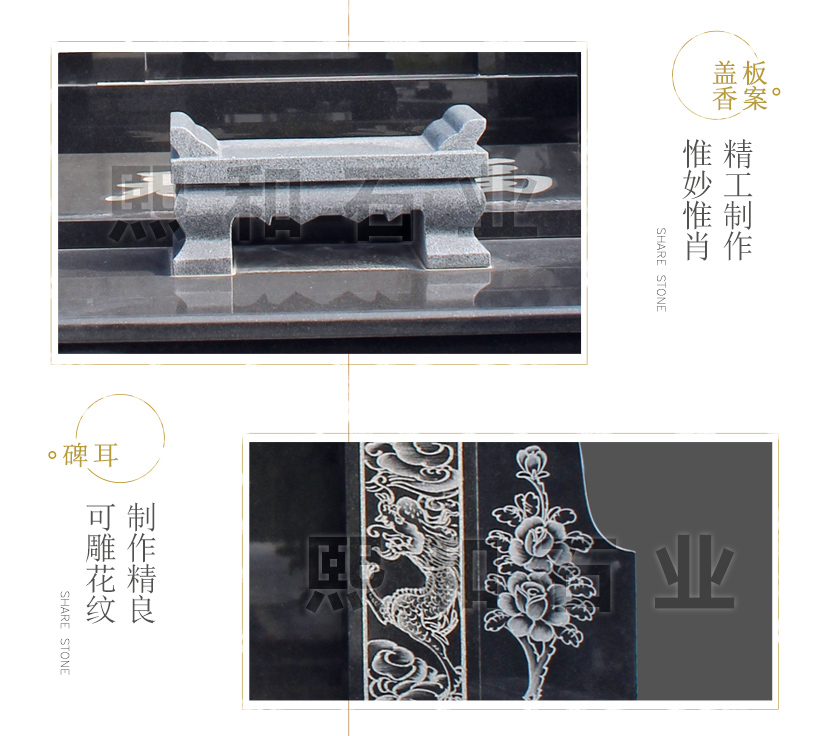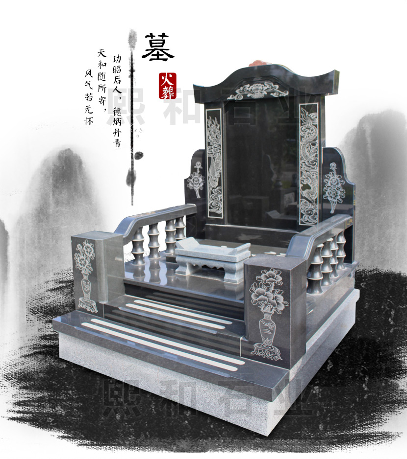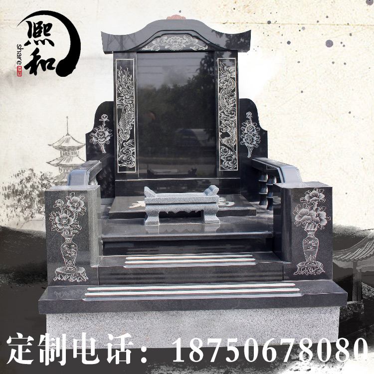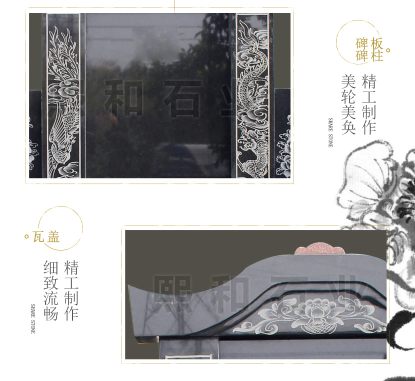 墓碑所使用的材料是最常用的石材山西黑,整体款式由山西黑石材雕刻而成,豪华大气。碑板为山西黑宽0.8米高1.2米组成,主要用来雕刻碑文。碑柱上的图案是龙凤呈祥对称图案。款式简单素雅,庄重大方,栏板上为隔空石雕柱子造型,加上碑柱两侧的碑耳和下沉的台阶。该款墓碑大致高1.8米,长1.35米,宽1.4米米墓碑。主碑板两侧碑耳上雕刻精美花朵图案。瓦盖上雕刻的是莲花图案,盖板上雕刻了一个大大的福字。盖板前方放置的芝麻黑石雕配件为拜台,用来摆放物品。整体造型设计非常和谐统一,整体美观度极佳。当然,这些碑型也是我们结合前人的智慧和客户对于传统文化寄托的需求,不断的深化和优化得到的成果,希望以此给逝者最好的归宿。