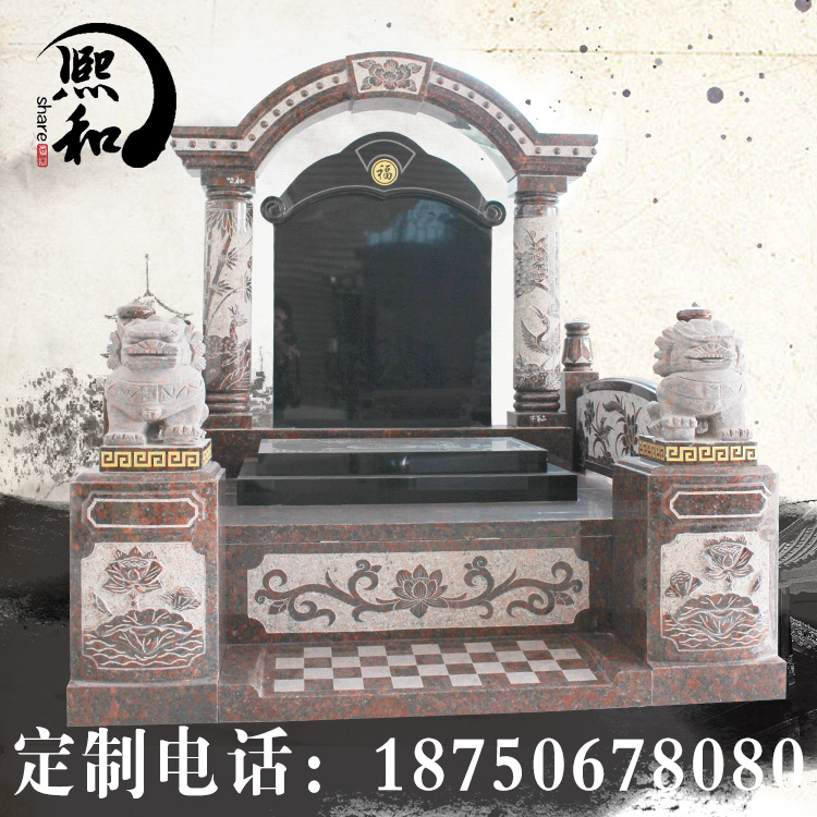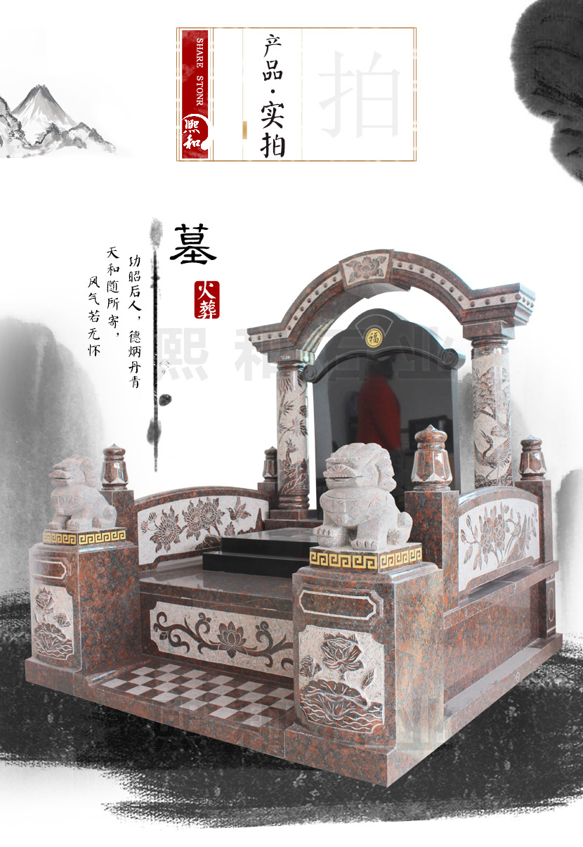 碑顶大弧线、浮雕祥云柱、宝瓶式栏杆、前端浮雕加圆球立柱,整体设计的元素都较为西式,不论是加工工艺还是设计元素都非常高端,连盖板上都有莲花花瓣的走边,台阶板是喷砂技术的格子图案。墓碑碑板为0.6*0.9米。墓碑整体长1.6米,宽1.4米,高1.8米。墓碑柱子上雕刻两尊石雕小狮子精美大方。