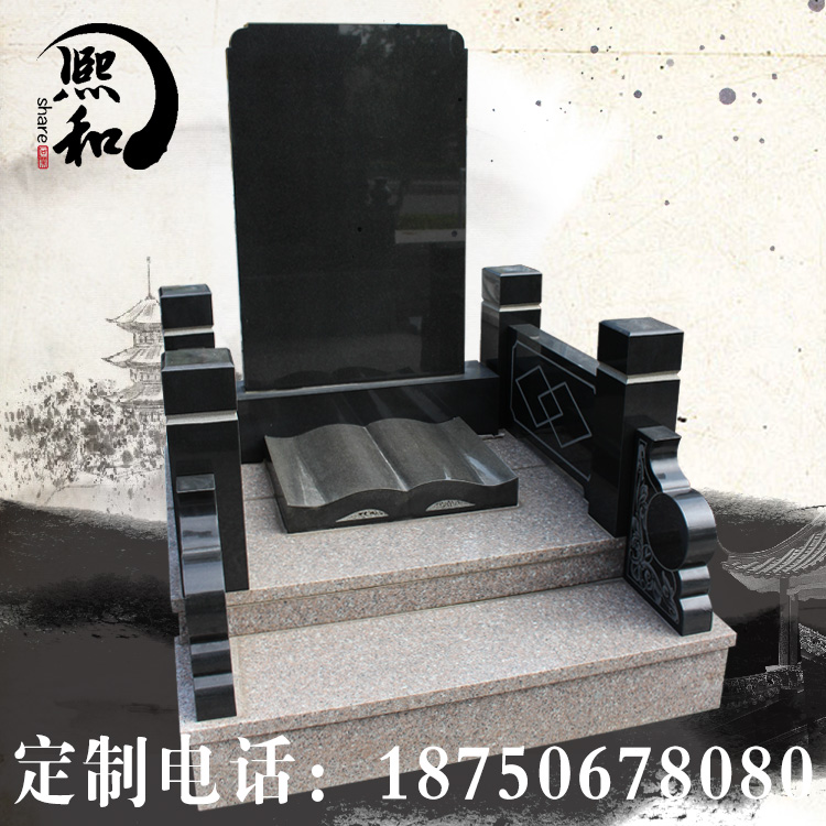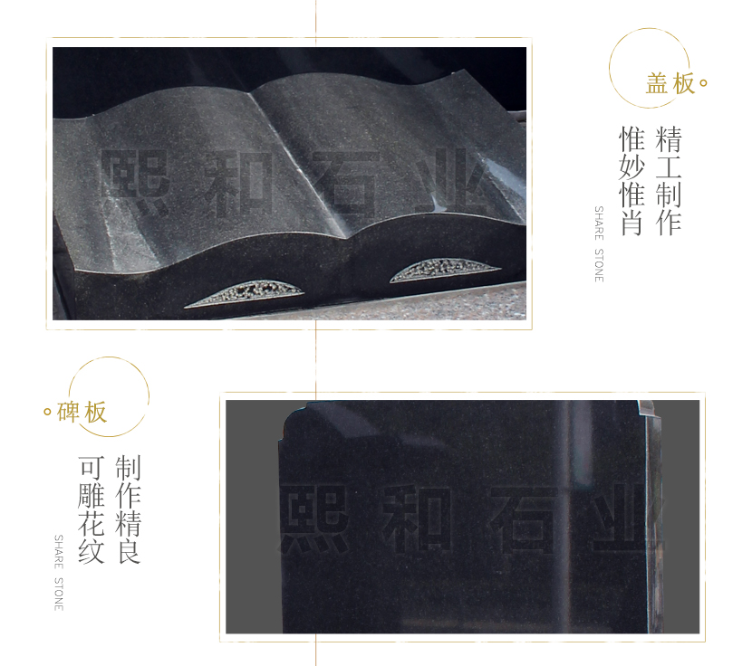 墓碑所使用的材料是最常用的主碑板山西黑,盖板芝麻黑相结合。碑板为山西黑宽0.4米高0.6米组成,主要用来雕刻碑文。款式 简单素雅,庄重大方,栏板上雕刻三个棱形环环相扣,加上碑柱两侧的碑耳和下沉的台阶。该款